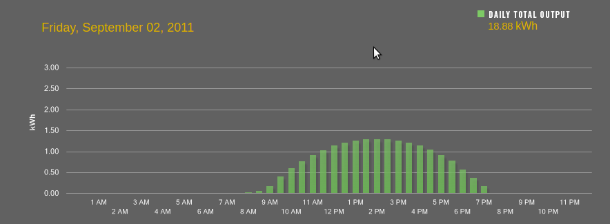 Here's the SolarGuard graph from Friday (which is quite typical for last week), a nicely shaped curved that closely follows light intensity over the day. We're topping out at ~1.3kWh around 14:00.