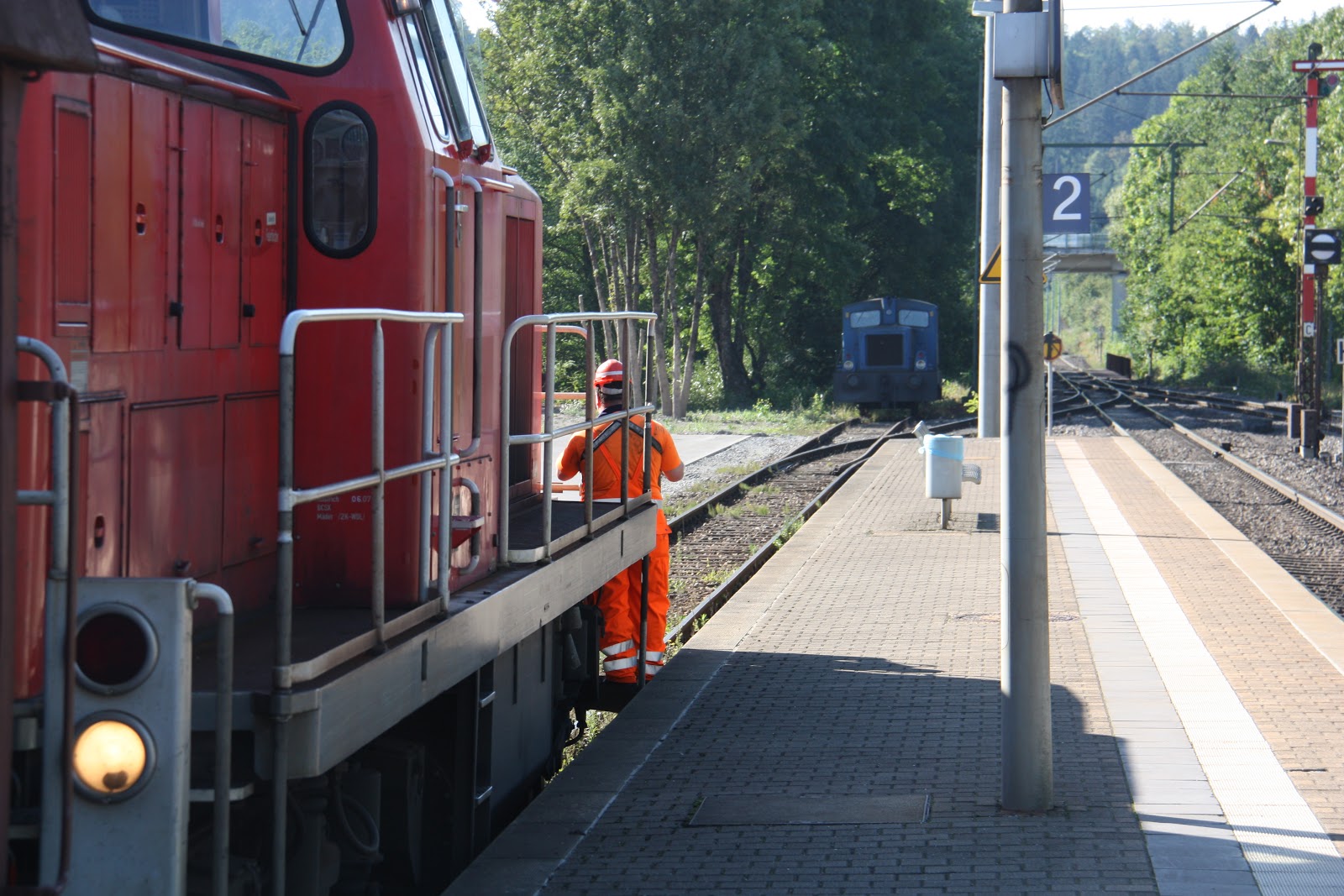 Note the little black box used by the Rangierfuehrer. The whole operation is done by one person. He brought the train to Fichtenberg, and does all the switching controlling the locomotive remotely.