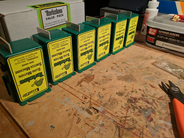Converting turnouts in assembly line fashion optimizes work time, since I can apply a set of puko strips as needed and let the glue dry on one turnout, while I work on assembling another turnout. Here are my five test turnouts in various states of completion.