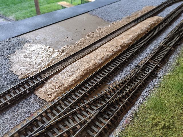 Once the Scuptamold is dry, I'll sand it, so that there is a more even rise towards track 2. On track 1 I filled the gaps between the ties and the pukos with fine sand.